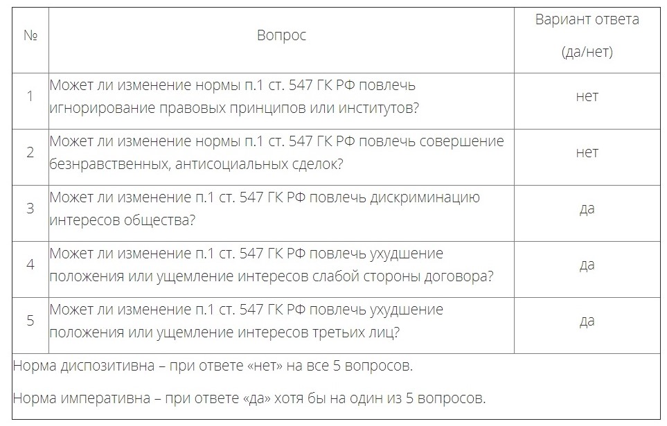 Положительный ответ хотя бы на один из вышеприведенных вопросов может по логике Постановления № 16 свидетельствовать об императивном характере анализируемой нормы. Соответственно, диспозитивность нормы констатируется лишь при отрицательных ответах на все без исключения вопросы.