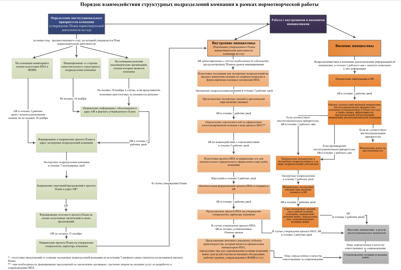 - Определение перечня эффективных внешних площадок для сопровождения внутренних нормотворческих инициатив компании.