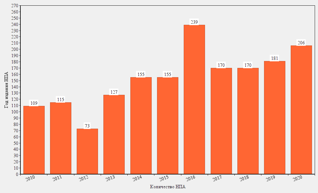Этот показатель на 25 НПА превышает количество актов, изданных в 2019 году, и стал вторым за время наших наблюдений, начиная с 2010 года (см. график).
