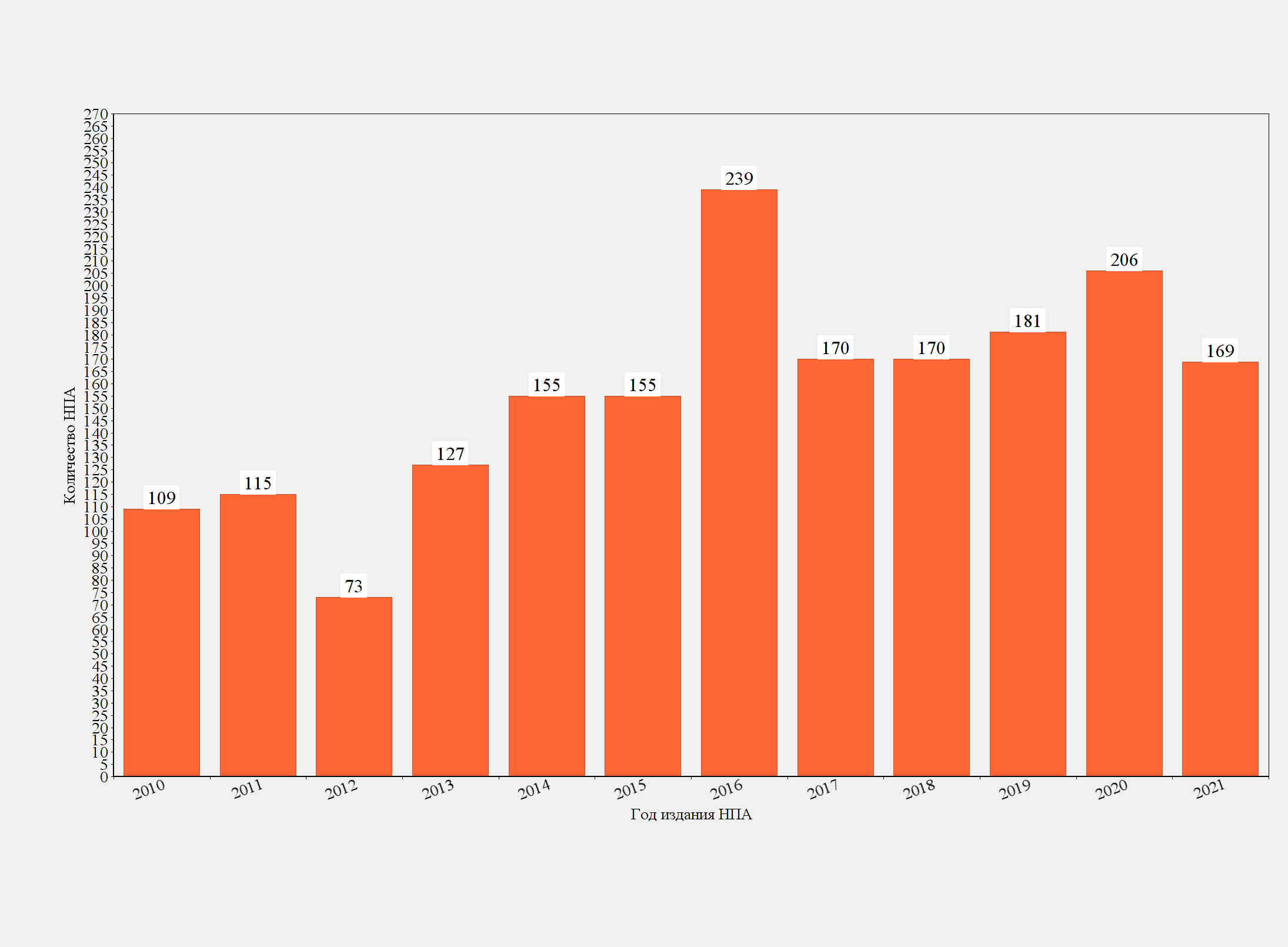 Этот показатель на 37 НПА ниже количества актов, изданных в 2020 году, и стал седьмым за время наших наблюдений, начиная с 2010 года (см. график).